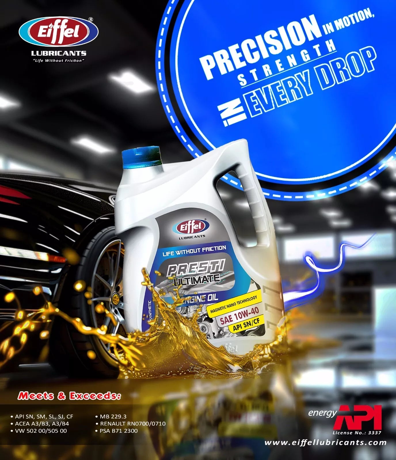 Eiffel Presti Ultimate series 10w40 is formulated with fully synthetic base stocks and advanced technology additive system to provide extra high level of engine protection and performance. It is suitable for higher mileage gasoline and diesel powered modern automobiles requiring an API SN/CF specification, where very high viscosity index oils are preferred to provide much longer oil drain intervals & fuel efficiency in modern engines. It provides maximum protection in engines operating under severe conditions, including highperformance turbo-charged, supercharged gasoline and certain diesel multi-valve fuel injected systems.